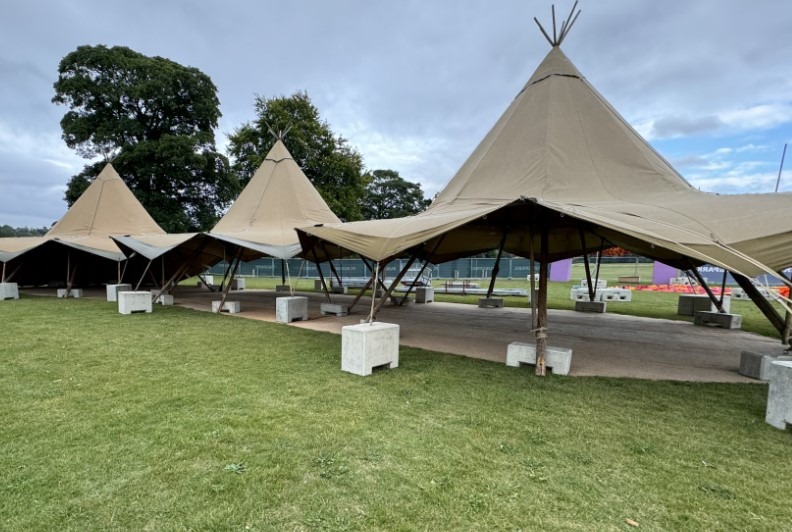 Les plots de lestage en béton : C’est la base. On vient fixer les pieds de la tente sur des blocs de 200kg, 500kg ou plus, selon la prise au vent. L’idée est simple : la tente doit faire corps avec le poids pour devenir immobile.